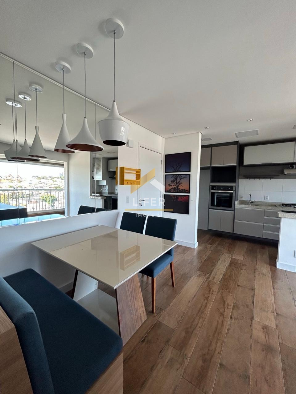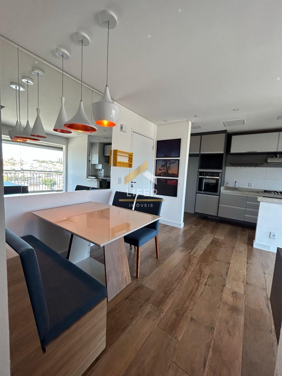 o Living é totalmente integrado entre sala, cozinha e sacada. A cozinha conta com Armários Palejados, Fogão Cooktop, Forno, Exaustor, e a sala possui painel instalado para a TV, além de uma mesa para quatro lugares, que será entregue junto. Lustres, Varanda com Churrasqueira de Inox, Vidros, Toldos também serão entregues. O segundo quarto está montado como escritório, com Escrivaninha e Prateleiras (pronto para um home office). Banheiro Social com Box de Vidro, Espelho, Armário Planejado, Suíte com Ventilador de Teto, Armário Planejado, com seu Banheiro com Espelho, Armário Planejado, Box de Vidro e iluminação em LED.