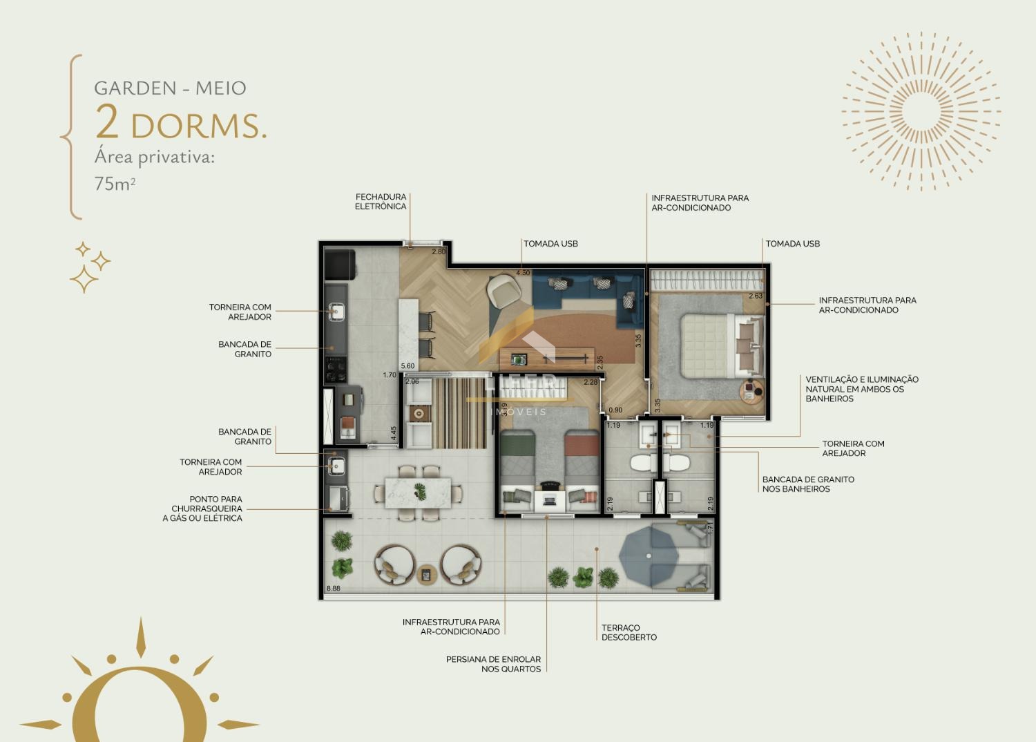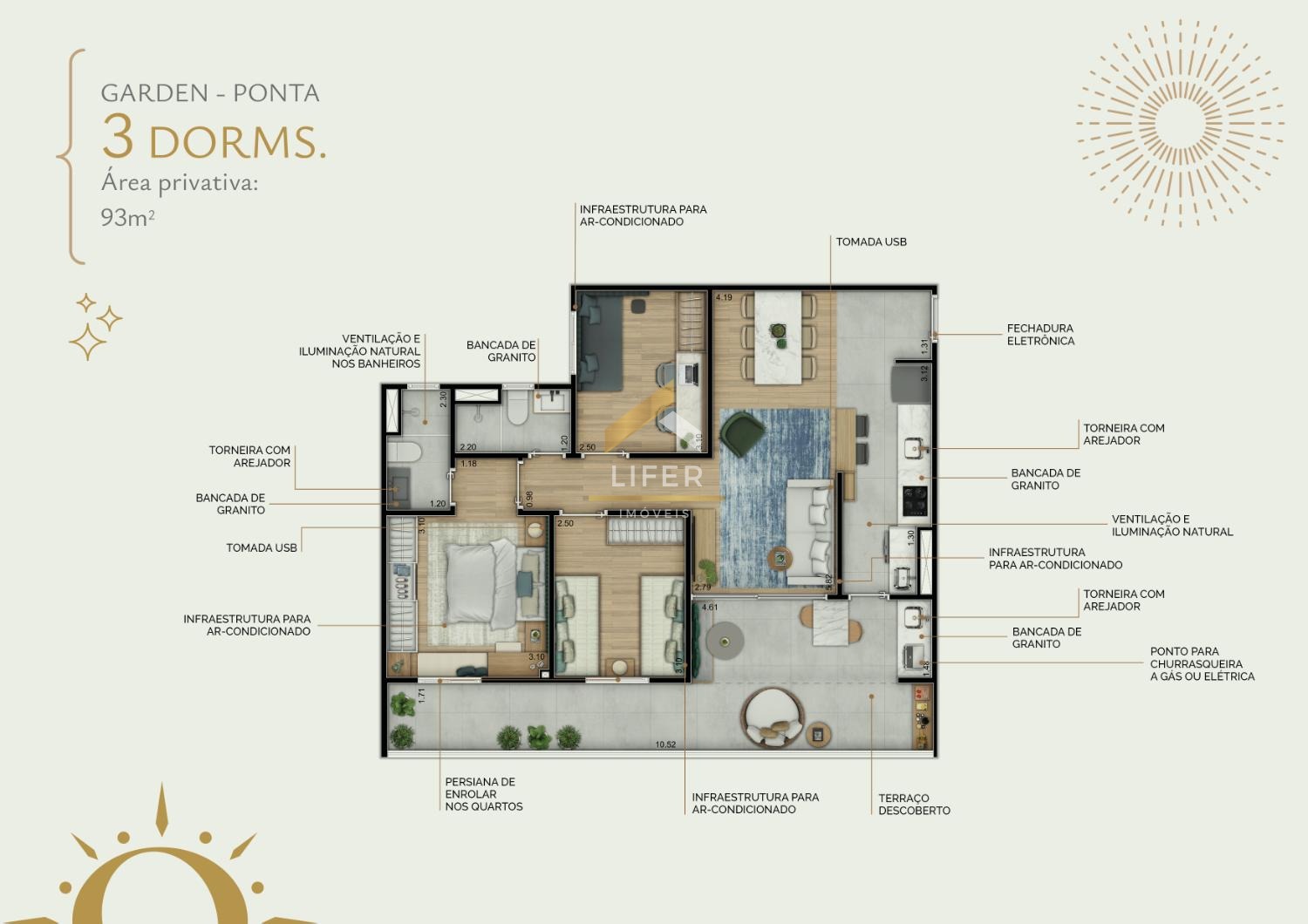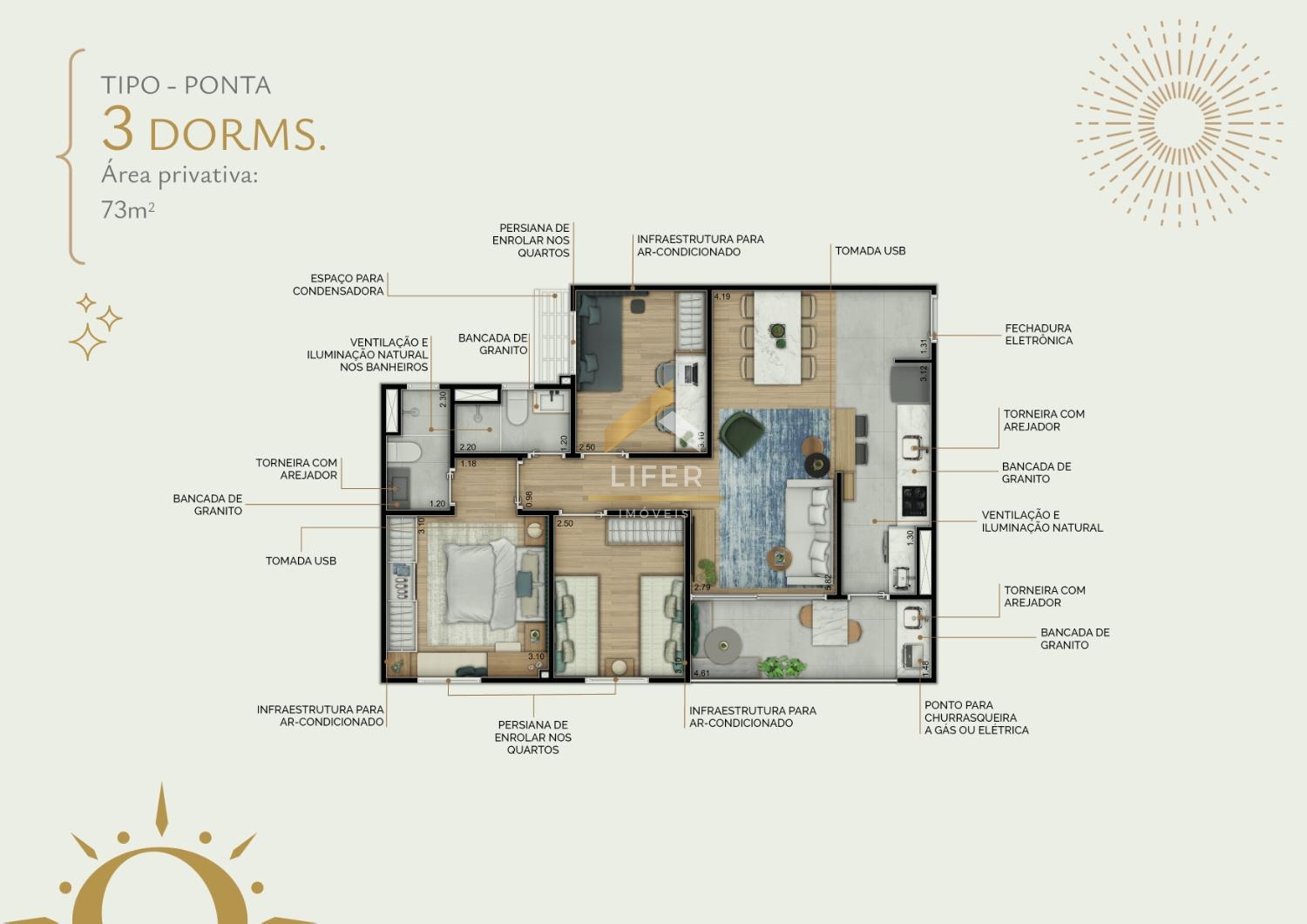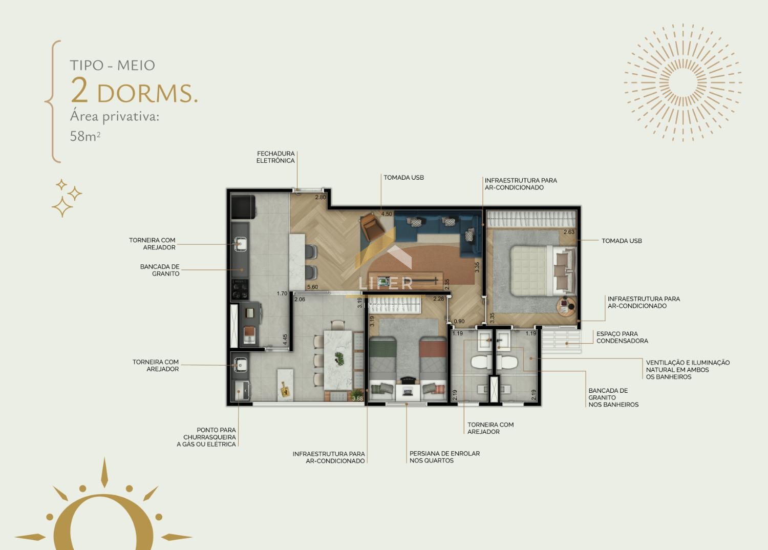 Diferenciais: ponto para churrasqueira elétrica ou a gás nos terraços, Wi-Fi nas áreas comuns, previsão para instalação de gerador de conforto (áreas vitais), infraestrutura para ar condicionado nas áreas de lazer e também nos dormitórios e salas das unidades, fechadura eletrônica, tomada USB nos dormitórios e sala, acesso delivery...