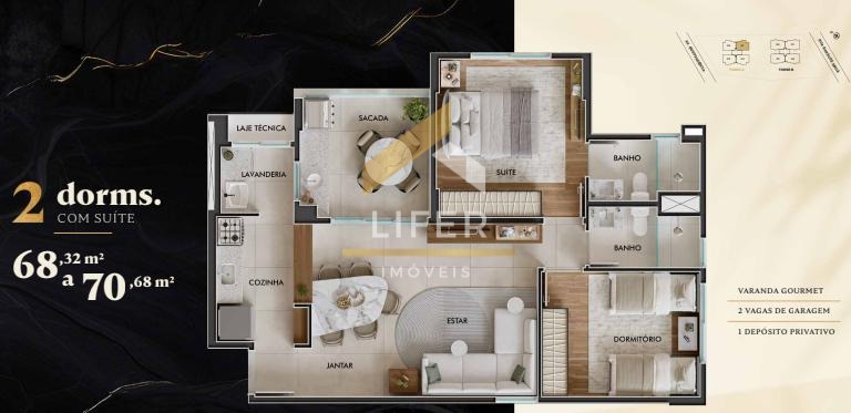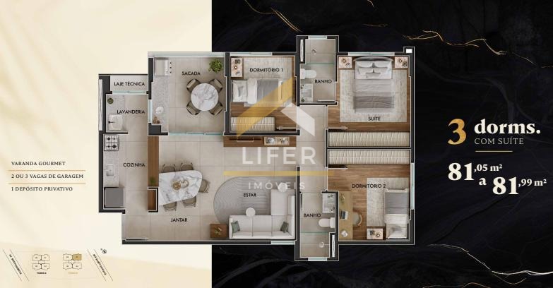 São 2 opções de planta com 2 ou 3 dormitórios com suíte 1 suíte e 2 ou 3 vagas de garagem e box privativo.