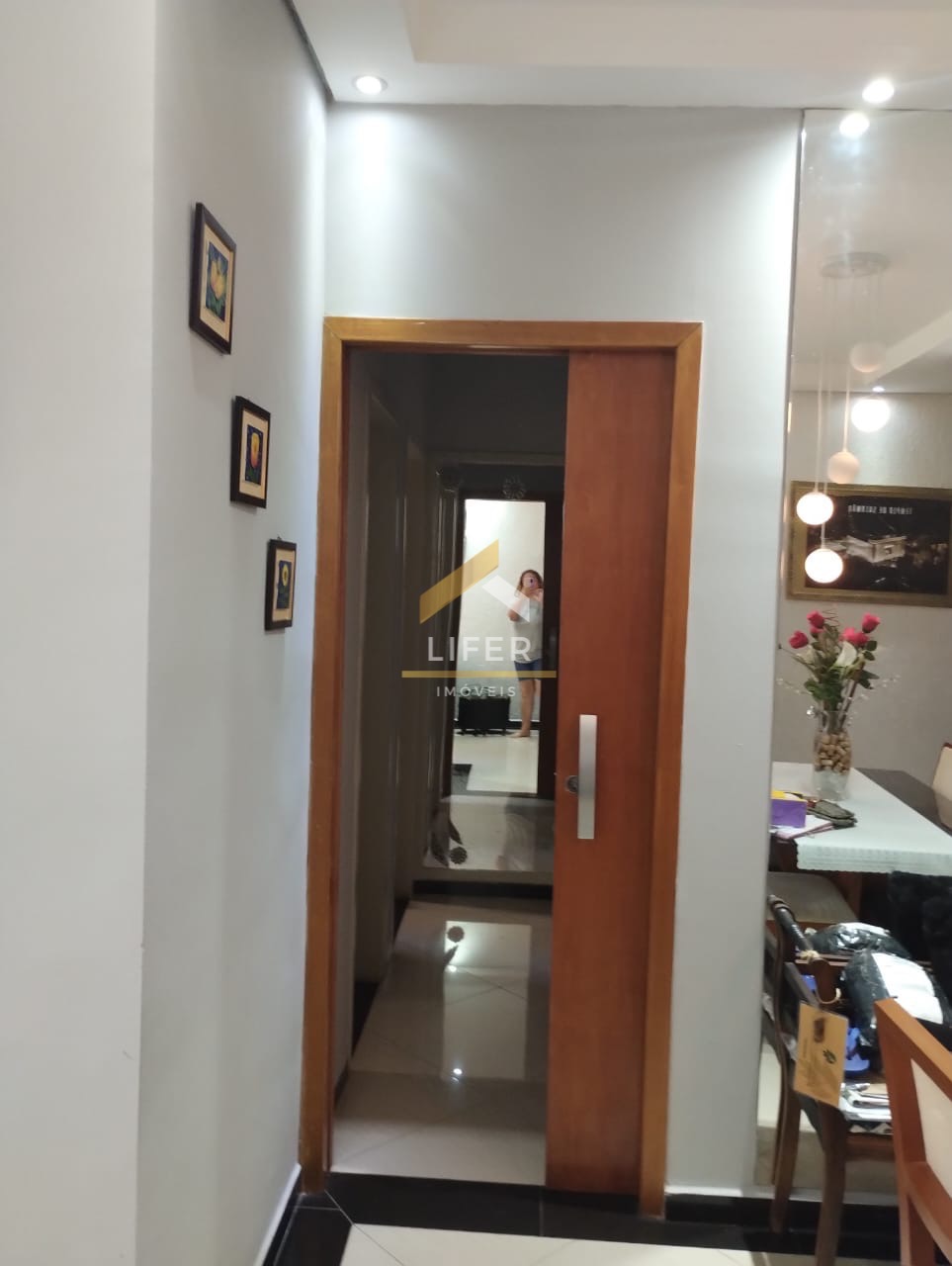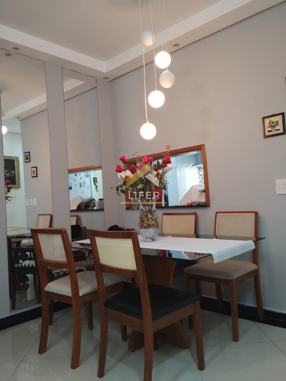Sala com 2 ambientes, cozinha estendida com despensa, área de serviço externa, pé dirijo alto com sanca iluminada, lustres, espelhos, porta com acesso aos quartos.