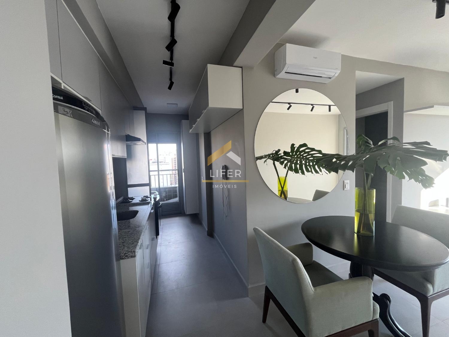 Apartamento com 2 dormitórios, sendo 1 suíte, com armários planejados, varanda, 2 salas, de jantar e estar, 2 banheiros com aquecedor a gás, com box e espelho, mobiliado com 1 mesa e 2 poltronas, aparelhos de ar condicionado nos 2 dormitórios e na sala, cozinha mobiliada com fogão embutido, depurador e geladeira e 1 vaga de garagem coberta