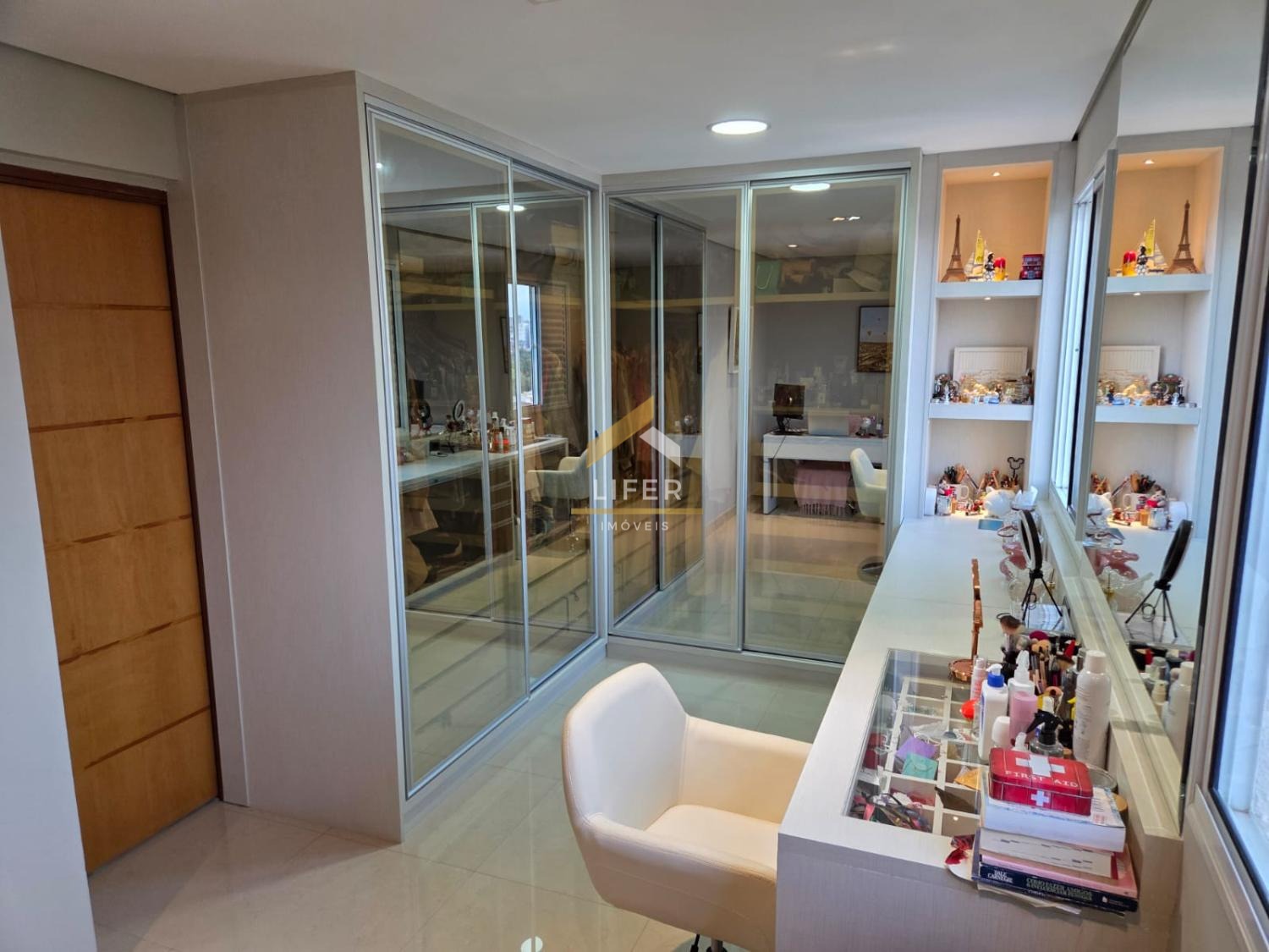 Armários embutidos em todos os cômodos, com portas em vidro reflecta
