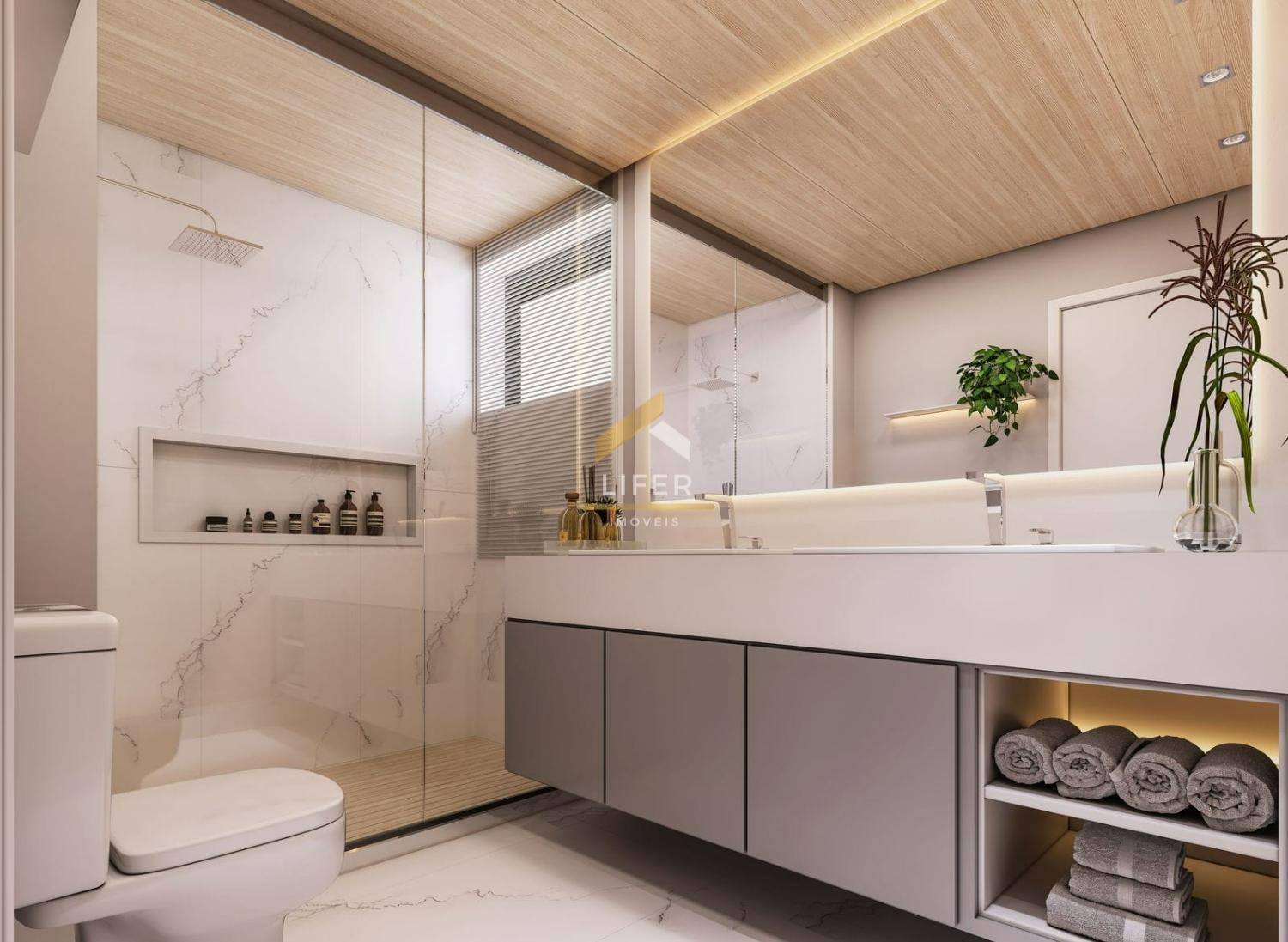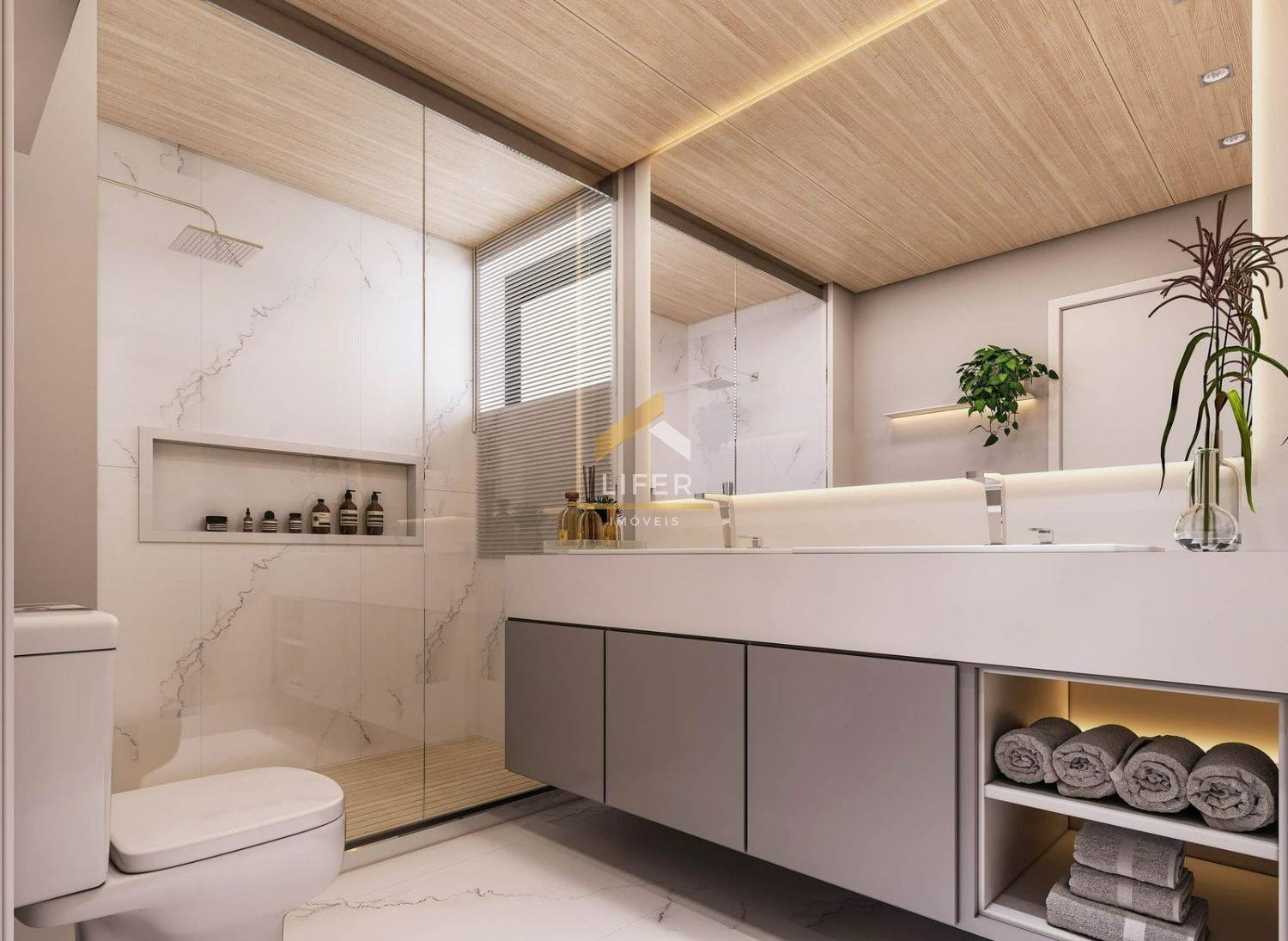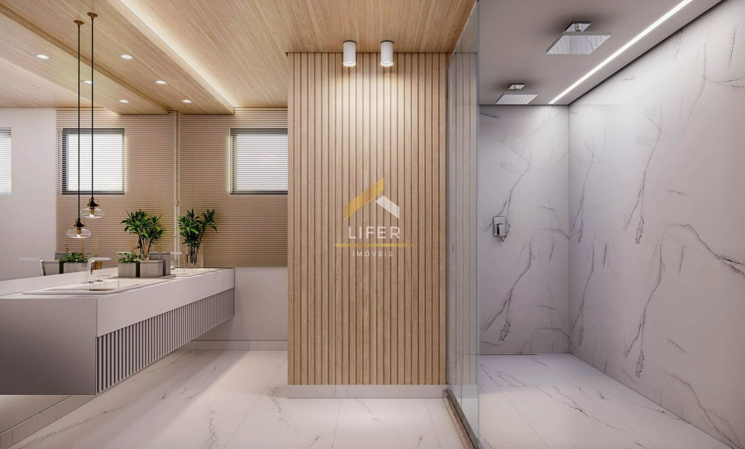 Porcelanatos de grande formato no piso e paredes dos banheiros.