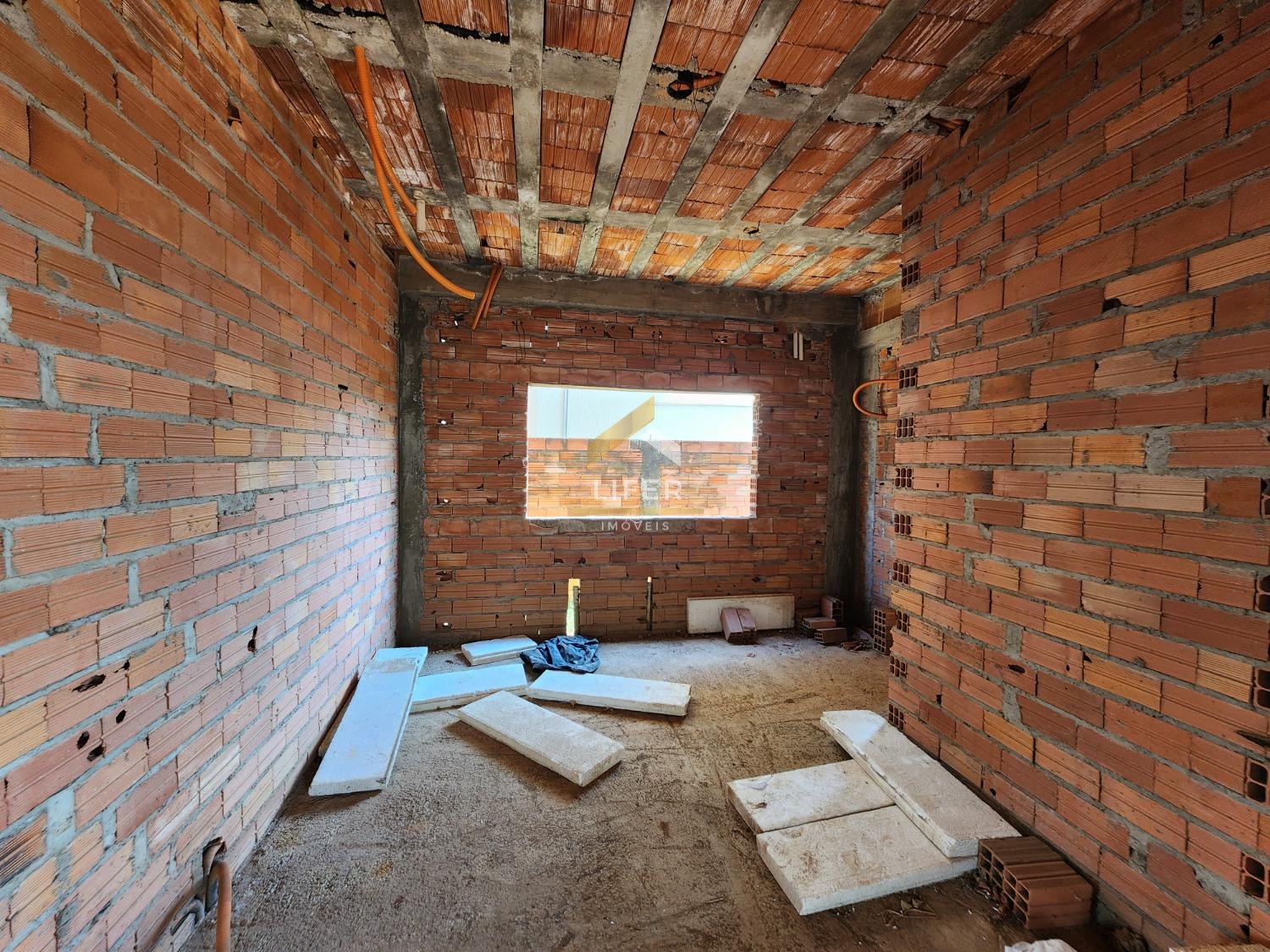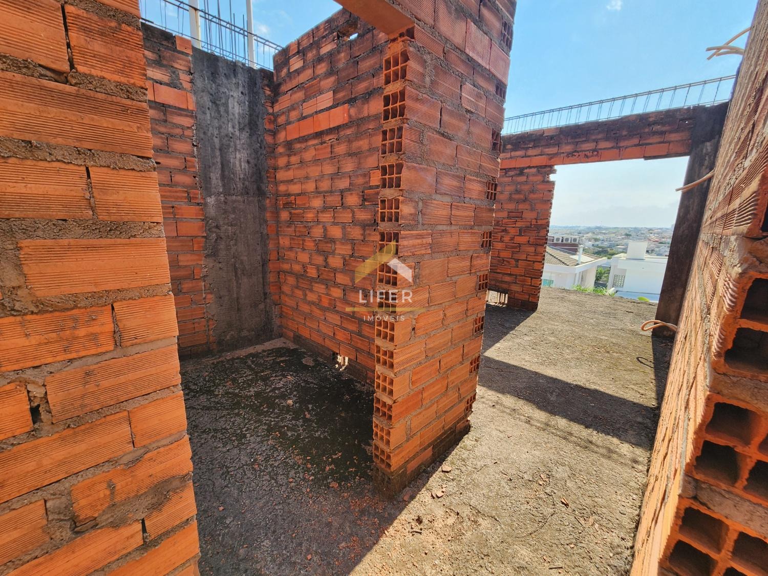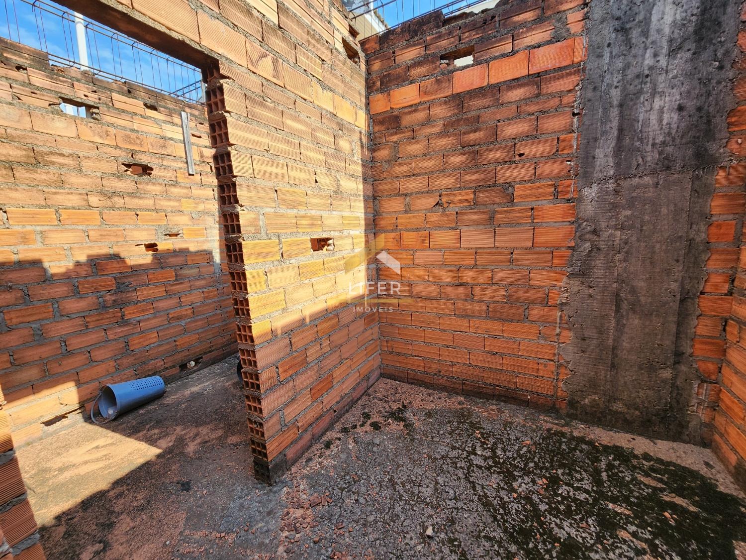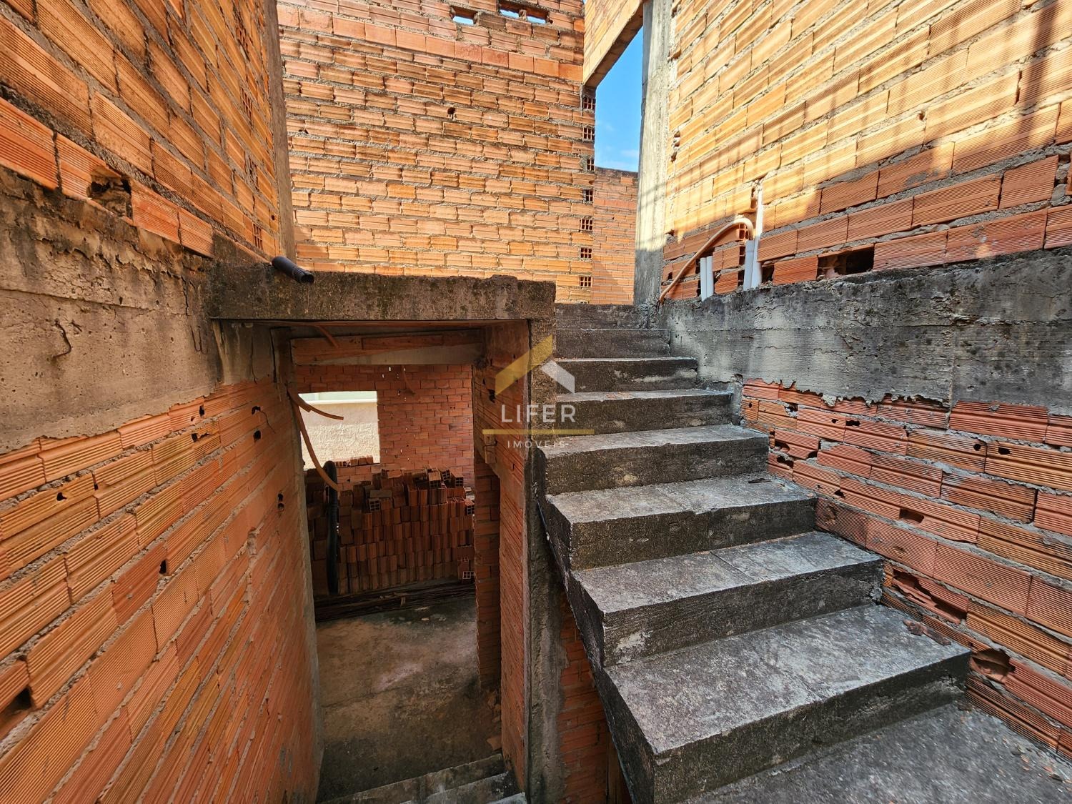 Obra com paredes e laje do pavimento inferior terminadas e paredes do pavimento superior já levantadas.