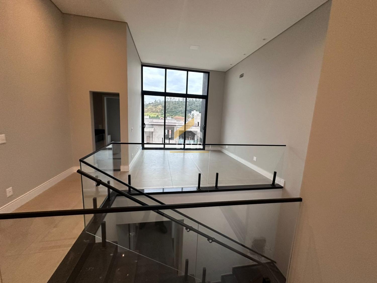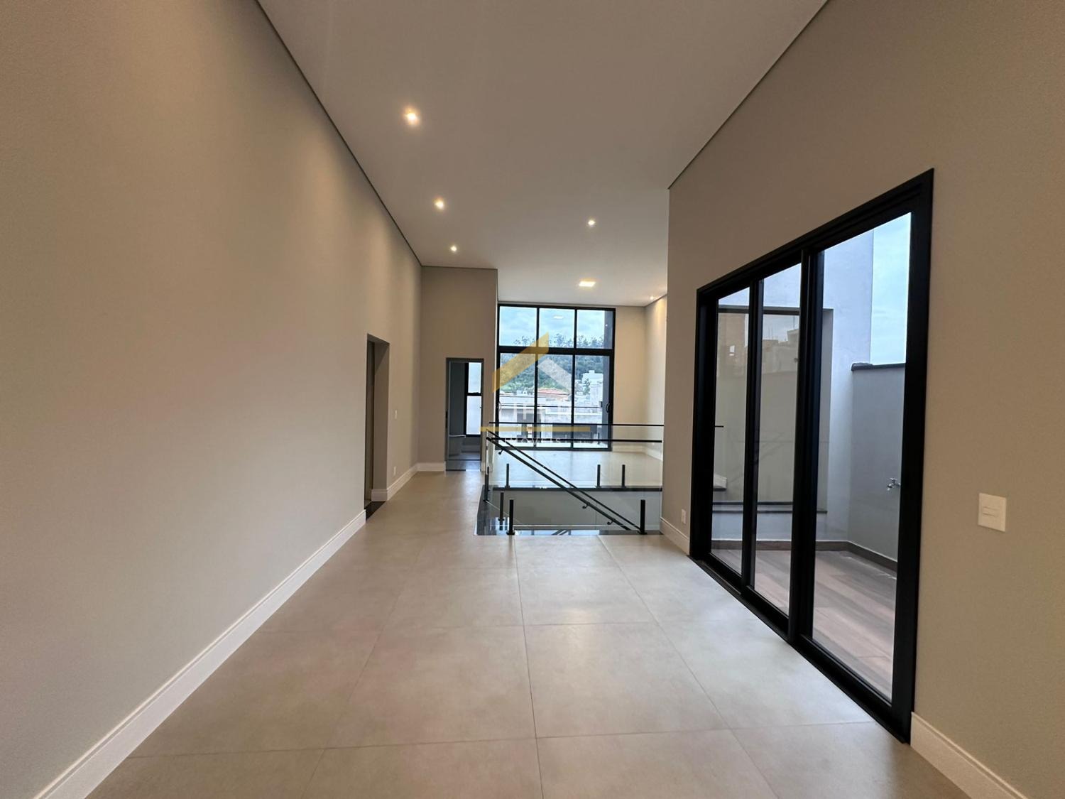 Persianas automatizadas, escada em granito preto São Gabriel, porta de entrada de alumínio e fechadura eletrônica marca Intelbras.