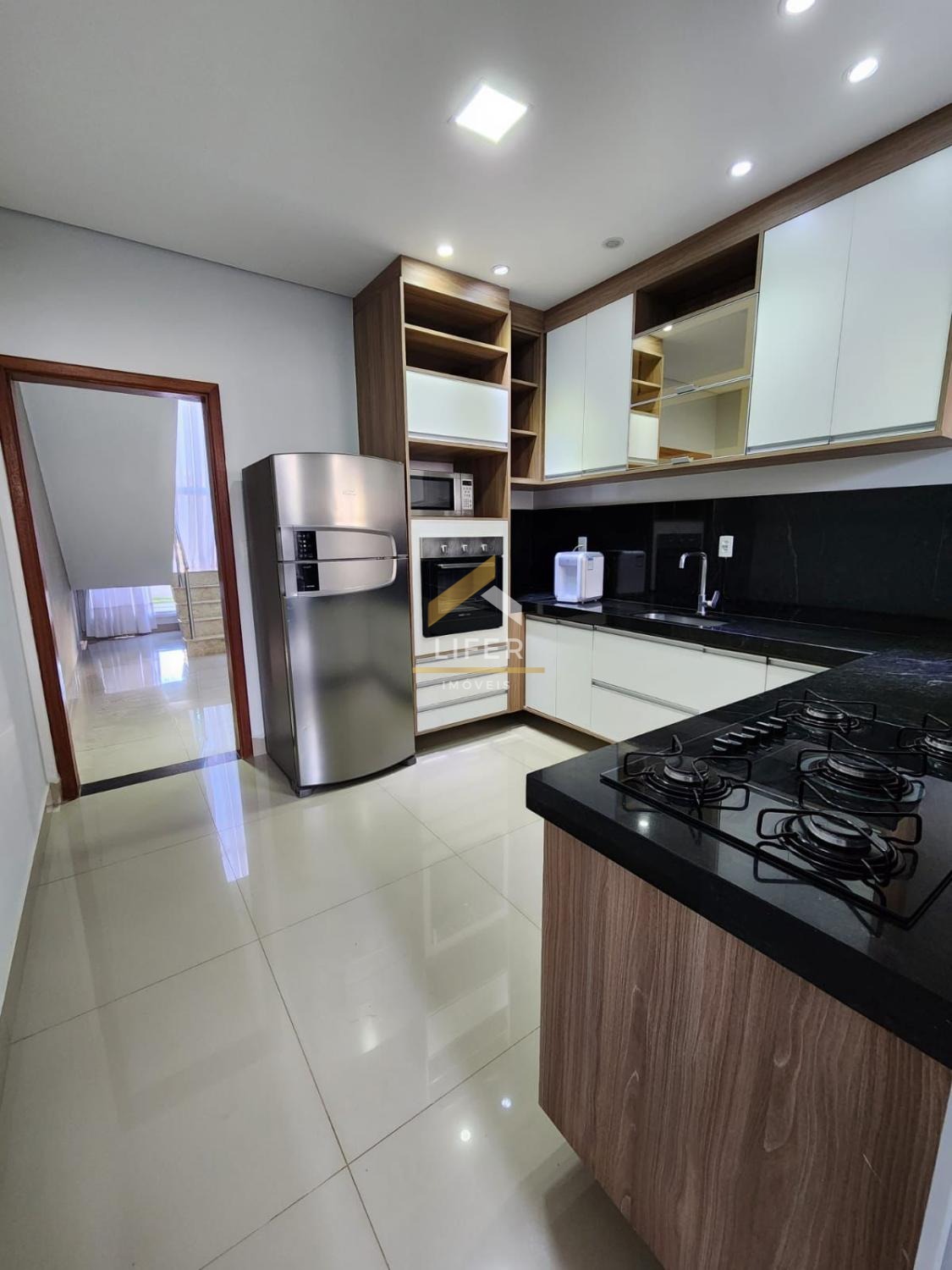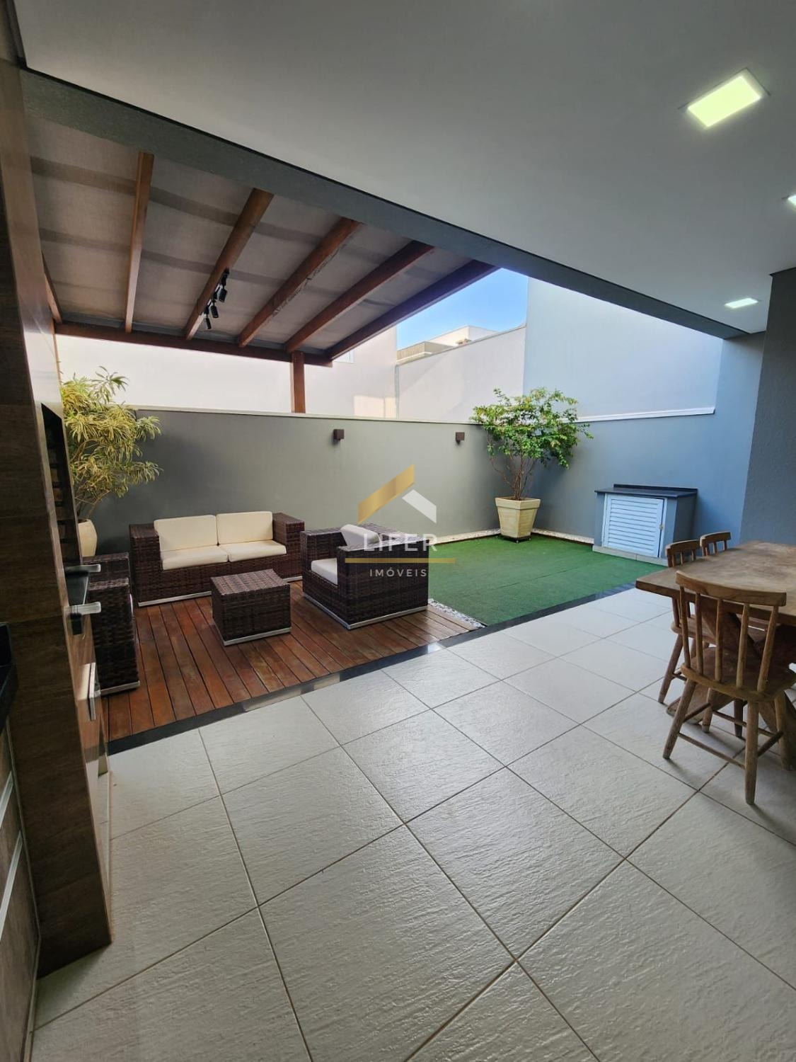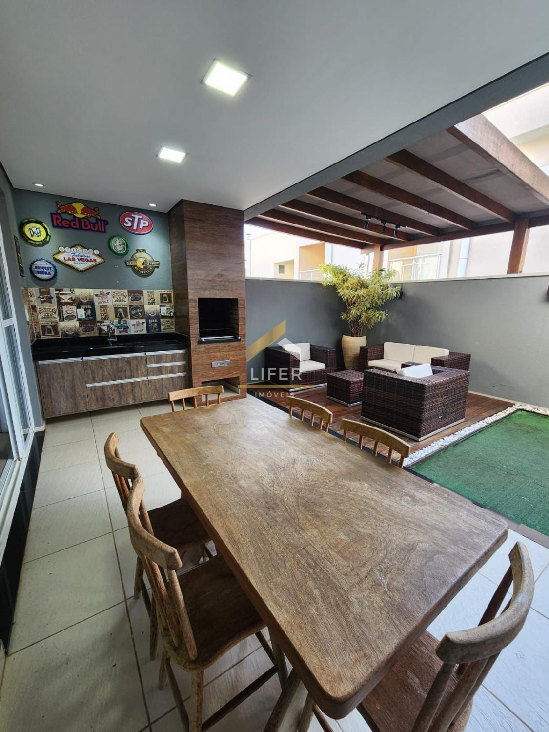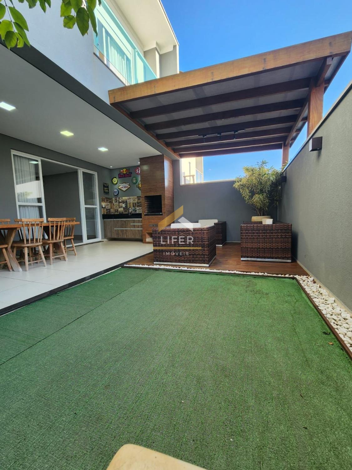 O living é dividido em 2 ambientes, sendo estar e jantar, proporcionando um espaço agradável e versátil para receber amigos e familiares. Além disso, possui lavabo; ampla cozinha equipada com armários planejados, uma pia espaçosa, cooktop e forno elétrico; A área gourmet coberta é um destaque à parte, com churrasqueira a carvão, pia com armários, deck em madeira e grama sintética, perfeita para momentos de lazer e área de serviço.