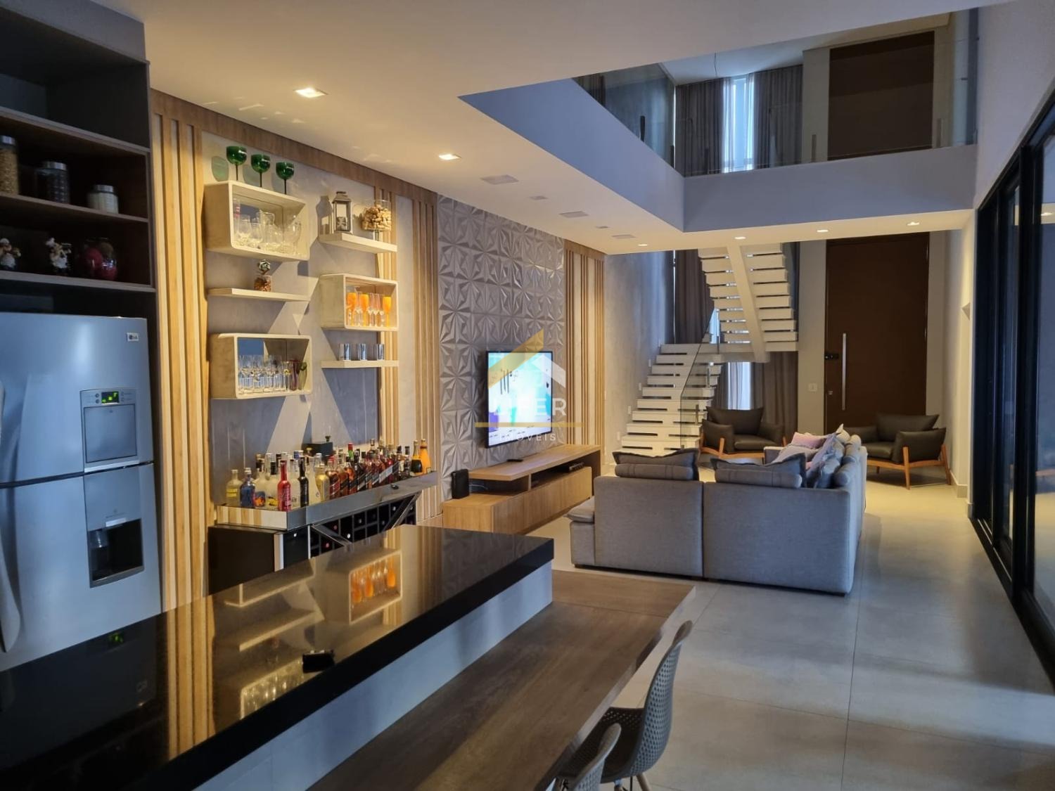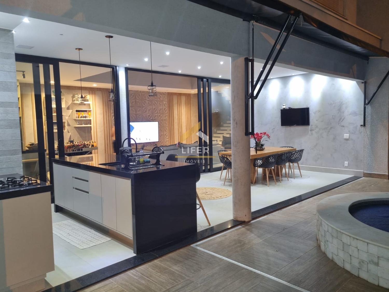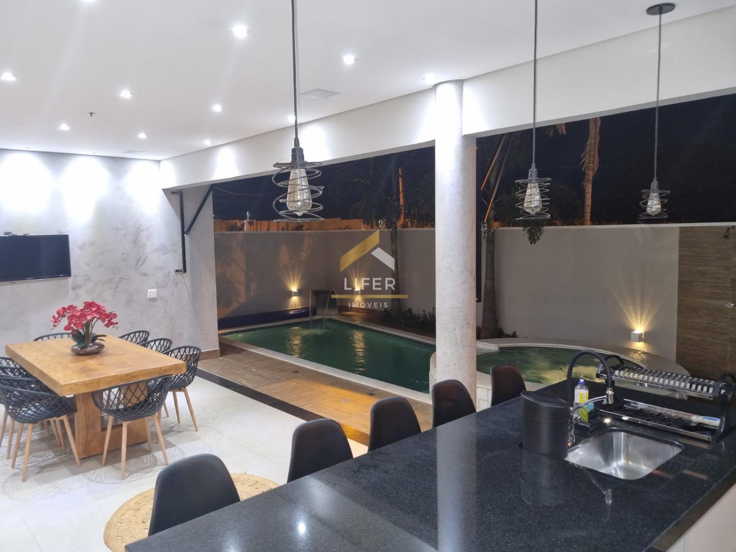 No pavimento térreo, a sala pode ser convertida em mais uma suíte, escritório ou brinquedoteca. A casa também possui lavabo, sala de TV e jantar com cozinha integrada, ampla lavanderia, piscina com aquecimento solar e iluminação, spa com hidromassagem, fechadura eletrônica, sistema de som ambiente JBL, toldos, alarmes e sensores, garagem interna espaçosa, ampla área gourmet com armários planejados, além de energia solar e fotovoltaica.