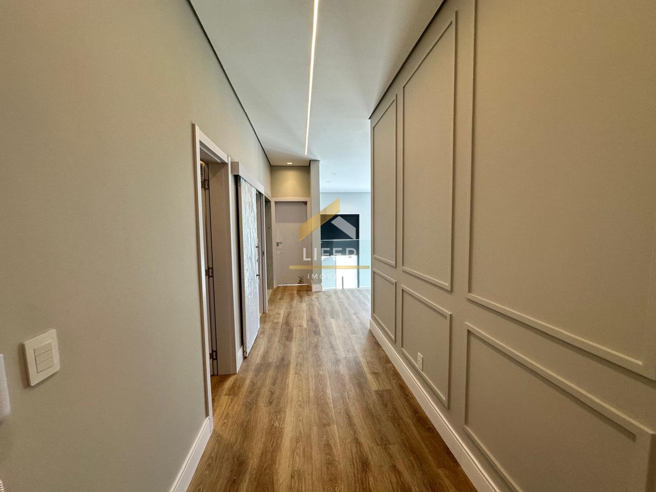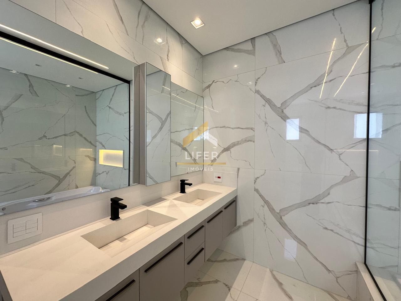 No pavimento superior, encontra-se a área íntima da casa, que conta com quatro amplas suítes. A suíte máster é um destaque, oferecendo um espaçoso closet, persianas automatizadas e um escritório privado, ideal para um ambiente de trabalho tranquilo. Todos os acabamentos são de alto requinte, com iluminação em LED que realça a beleza dos espaços e planejados em todos os ambientes.