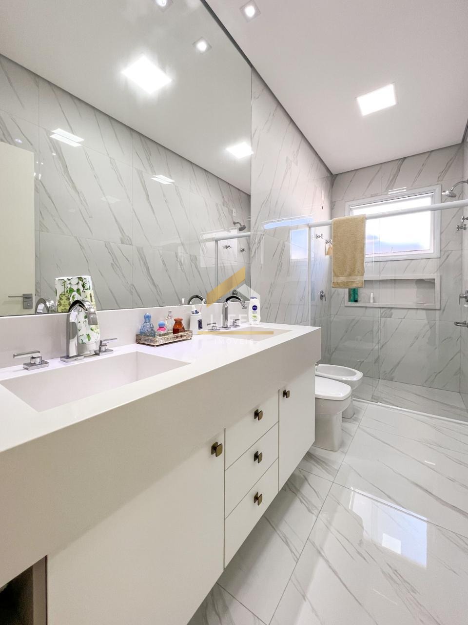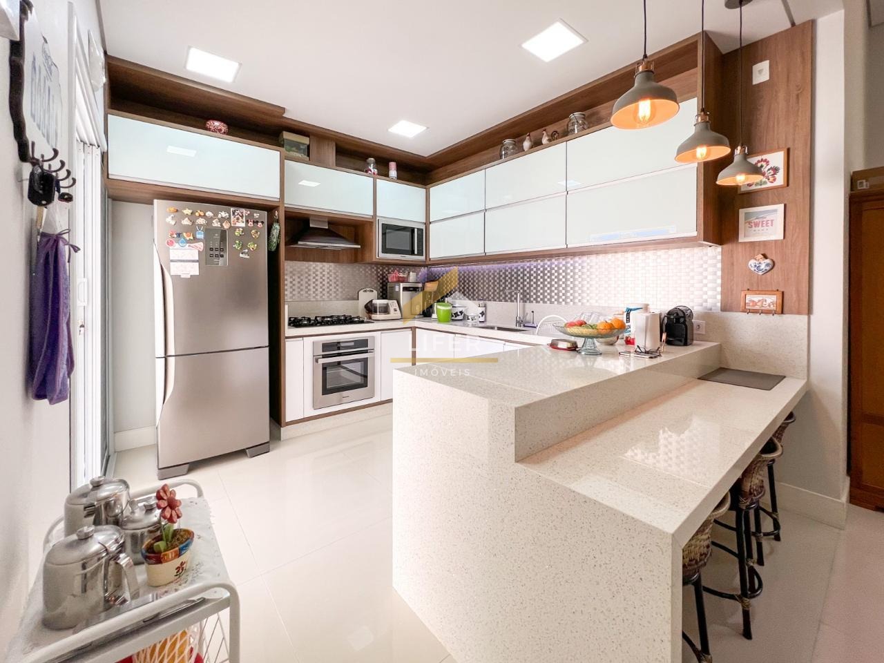 A área social possui pé direito alto, com iluminação em LED que valoriza cada ambiente. A sala de estar e jantar são integradas com a cozinha americana, feita com mármore branco estelar importado, equipada com armários planejados e eletrodomésticos modernos da Panasonic, incluindo coifa, cooktop, fogão elétrico e micro-ondas. Perfeita para receber com estilo, a cozinha também possui uma mesa para refeições rápidas, ideal para o dia a dia.