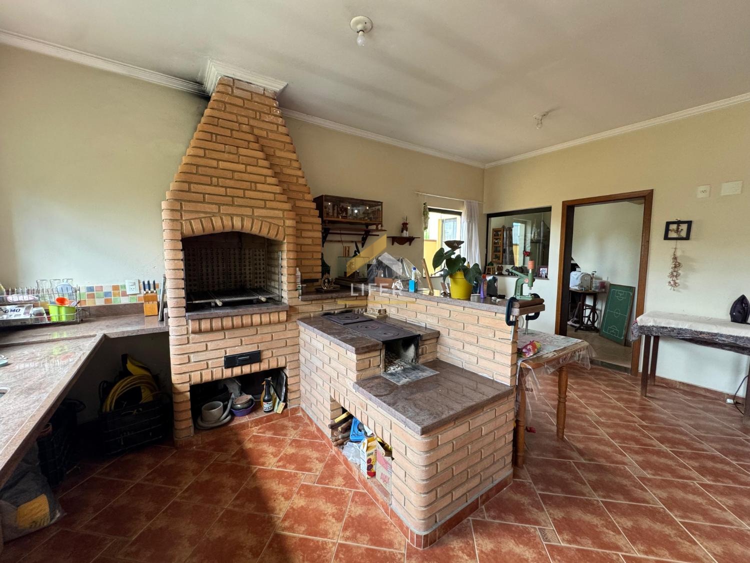 No pavimento inferior, fica a área gourmet, com churrasqueira e forno/fogão a lenha, é ideal para momentos de lazer com a família e amigos. Além disso, o imóvel conta com um pequeno estúdio e um banheiro social, que agrega mais comodidade ao espaço. Ao redor da casa, vários pomares de frutas garantem um toque de natureza e tranquilidade.