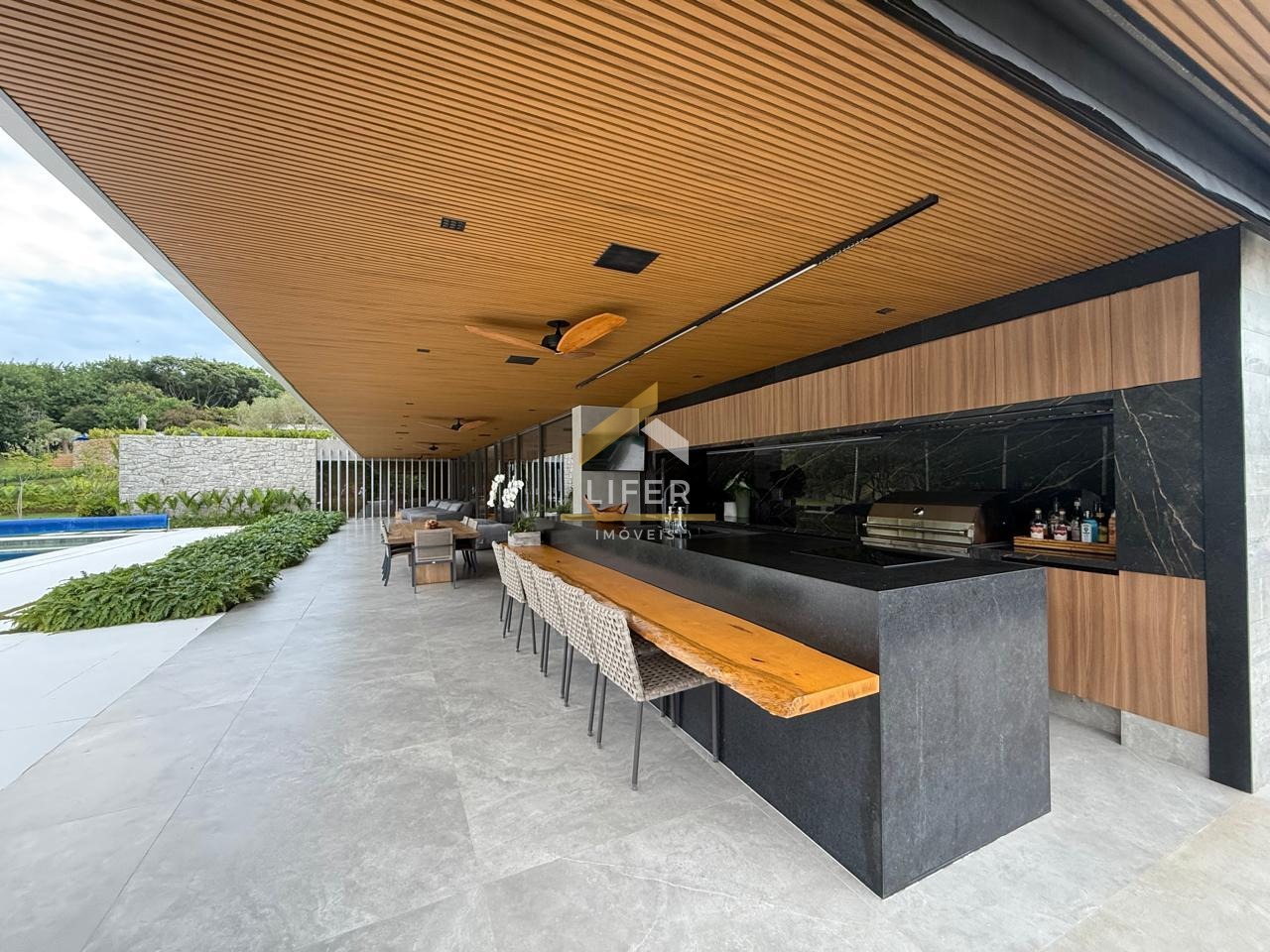 O espaço gourmet, estrategicamente situado na varanda, é ideal para confraternizações, com capacidade para 14 pessoas, churrasqueira e total integração com a cozinha planejada, despensa e lavanderia, o que torna o ambiente ainda mais funcional e elegante. Para momentos de lazer, a residência conta com uma deslumbrante piscina de borda infinita, acompanhada de móveis HIO e Artefacto, criando um ambiente ideal para relaxamento. Além disso, a laje para festas, com bancada para DJ, oferece uma opção de entretenimento sem igual, enquanto o mini campo de futebol, cercado por rede de proteção, é perfeito para momentos de diversão.