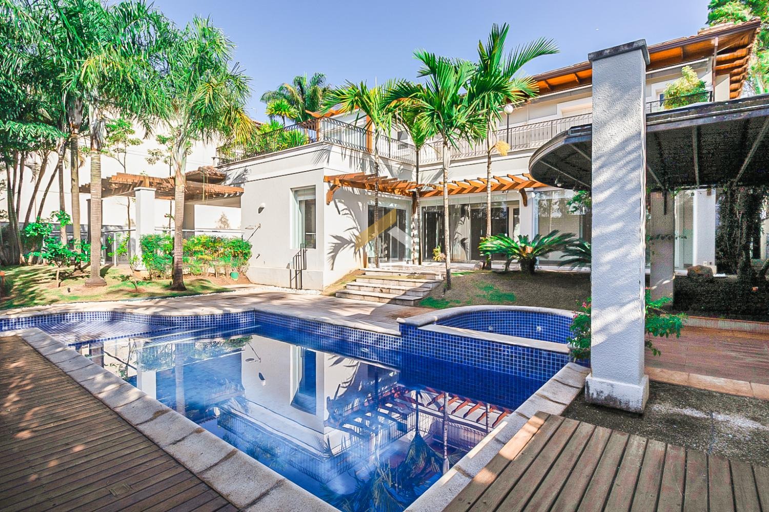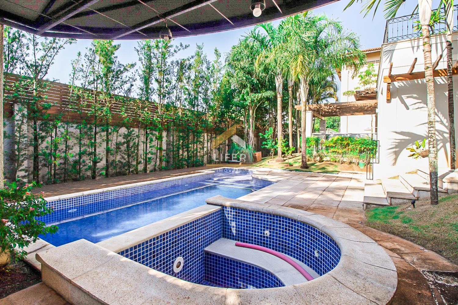 Entrada social com Hall, Home theater, Living dois ambientes com lareira, Escritório com lavabo, Jantar, Cozinha com despensa, Área de serviço com lavanderia, quarto e banheiro de empregada, Espaço gourmet com churrasqueira, Banheiro, Piscina com hidromassagem.