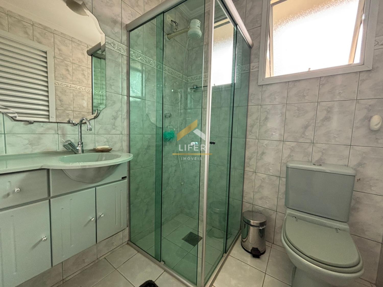 Banheiro social com gabinete, box de vidro e armário