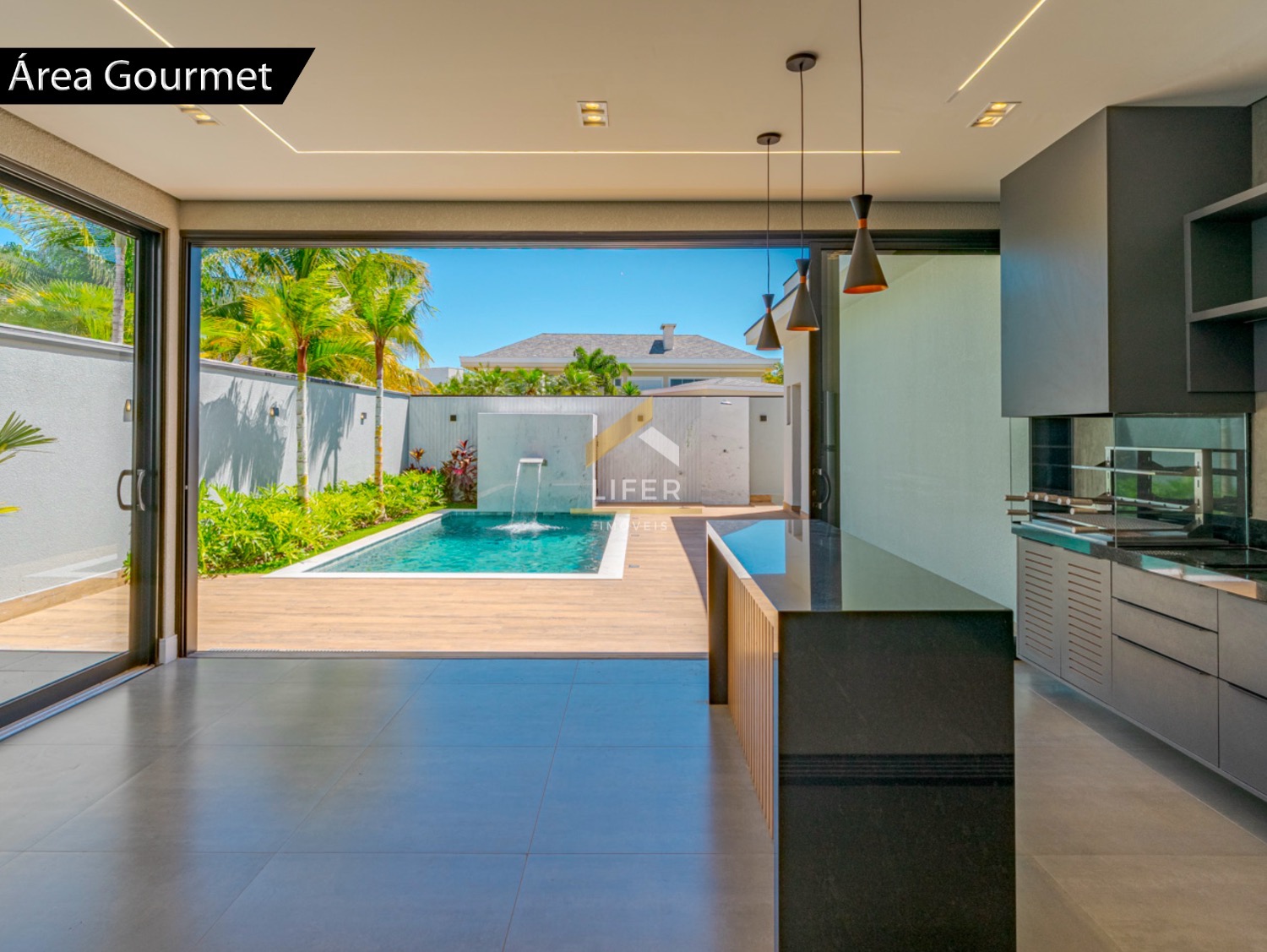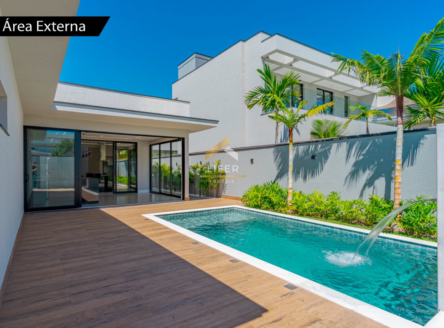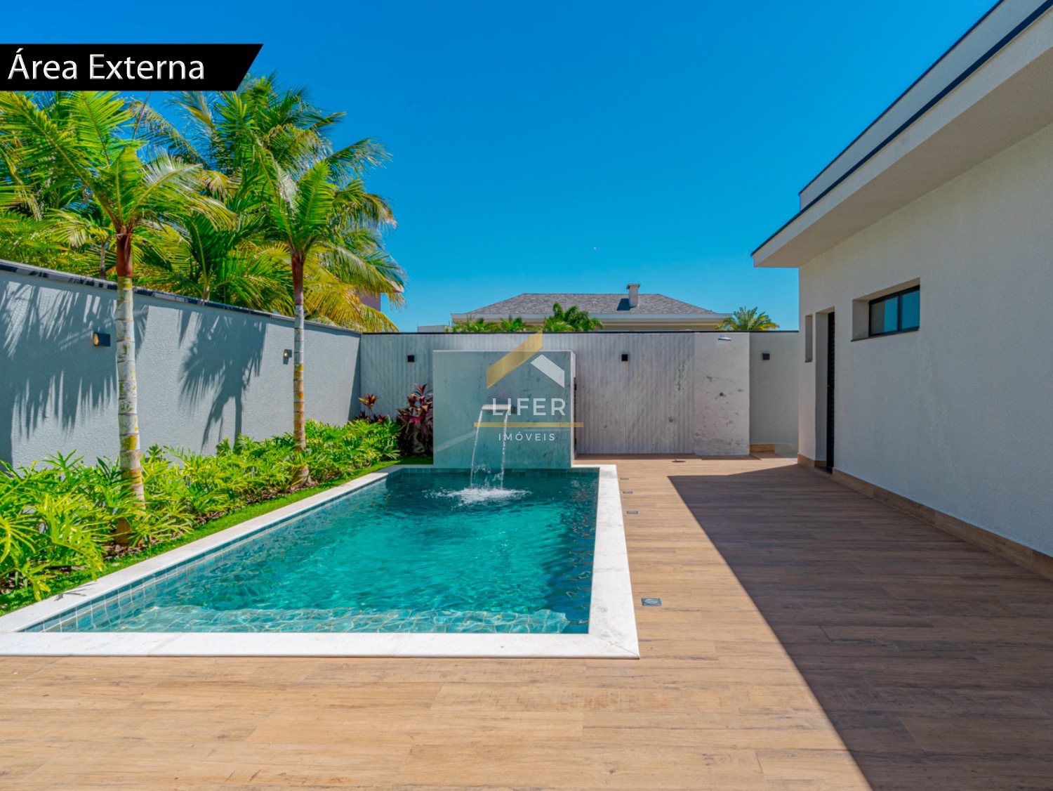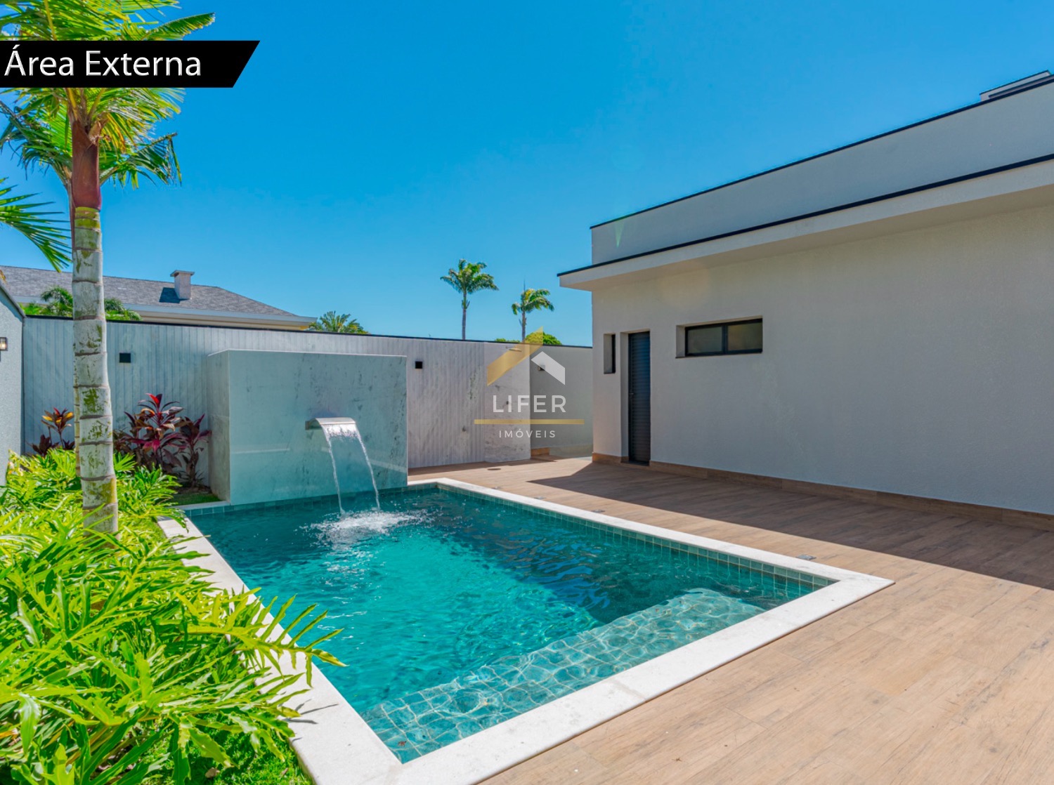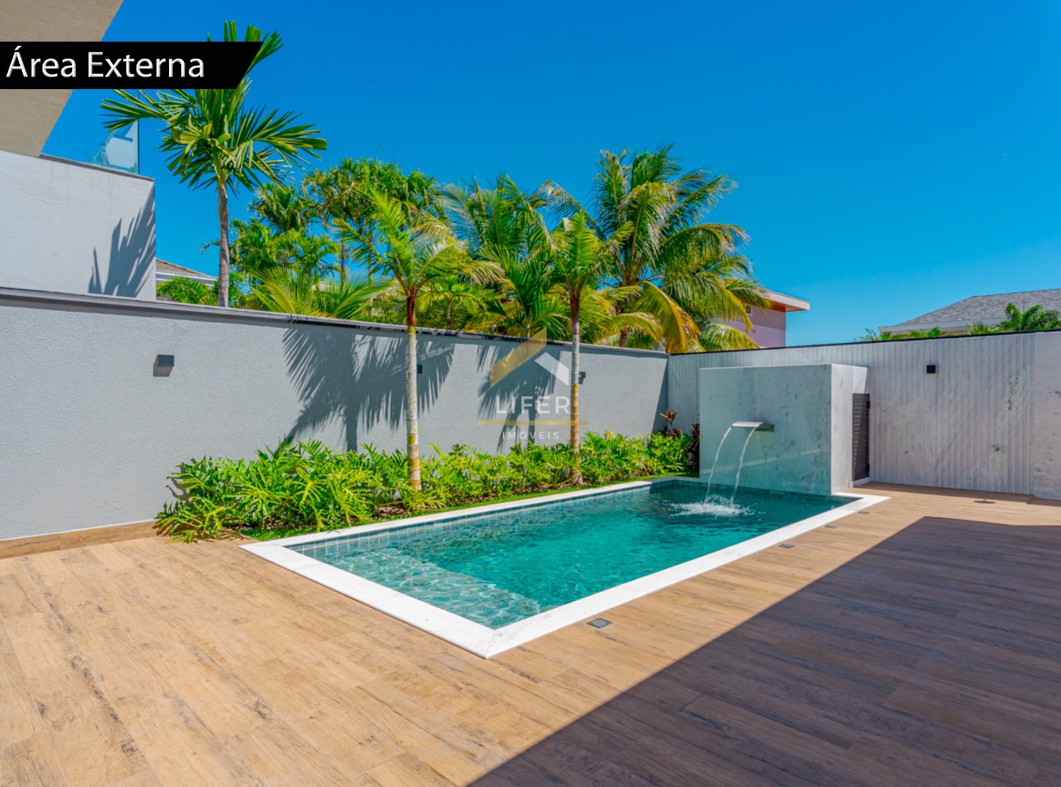 Na área externa, destaque para a piscina com cascata, ideal para momentos de lazer e relaxamento.