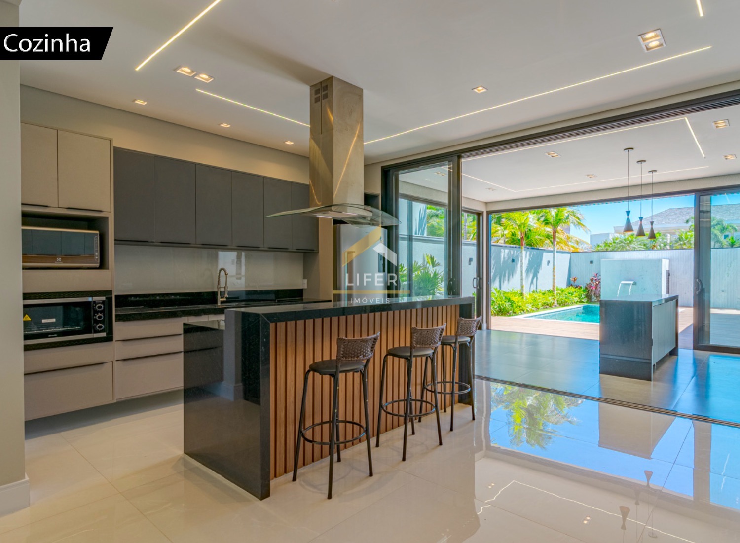 O imóvel oferece ar-condicionado em todos os ambientes, boiler instalado, persianas elétricas e acabamento de altíssimo padrão. A cozinha vem totalmente equipada com geladeira inox, cooktop, forno, coifa (depurador) e micro-ondas.