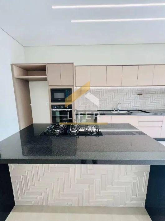 A cozinha planejada é moderna e funcional, equipada com cooktop e torre quente com forno e micro-ondas, oferecendo praticidade no dia a dia. O imóvel ainda dispõe de despensa, lavanderia fechada e banheiro externo, trazendo mais organização e comodidade.