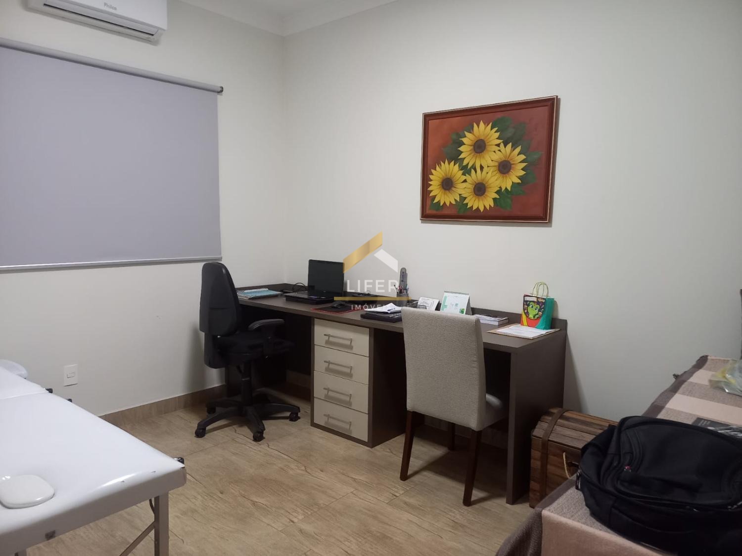 Cômodo com banheiro, atualmente utilizado como escritório, com possibilidade de reversão para home office ou suíte.