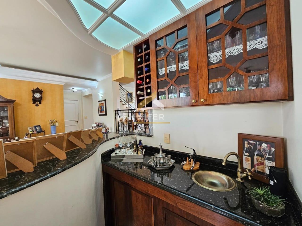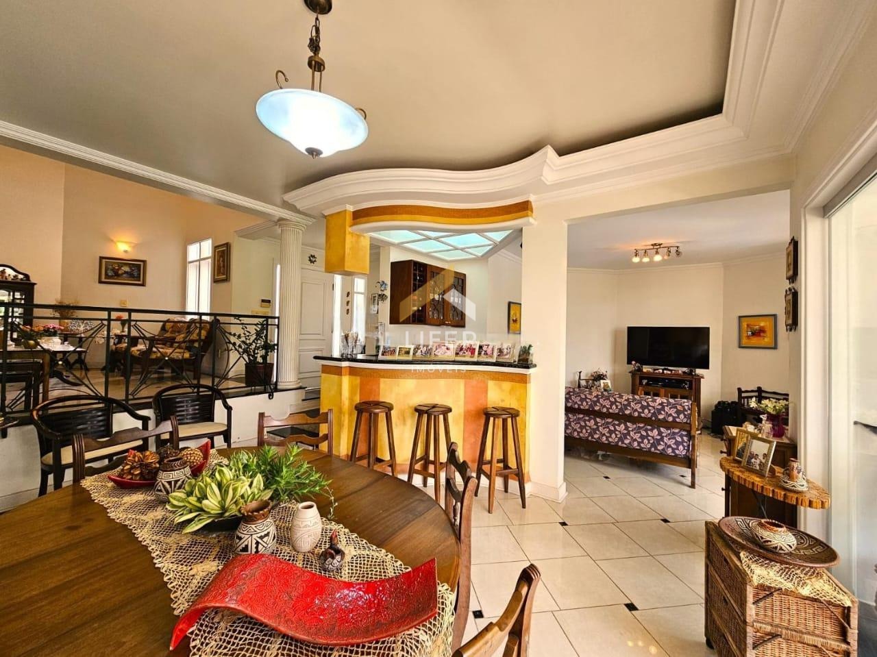 Logo na entrada principal, a casa impressiona com seus ambientes bem distribuídos e lavabo de apoio. São diversas salas que proporcionam conforto e versatilidade, incluindo sala de estar com lareira e pé-direito elevado, sala de TV, sala de jantar e uma segunda sala de estar, todas pensadas para receber com requinte e aconchego. A cozinha é totalmente planejada, conta com despensa e se integra perfeitamente à área de serviço, que dispõe de bancada e armários. O imóvel ainda oferece uma área de apoio completa para auxiliar do lar.
