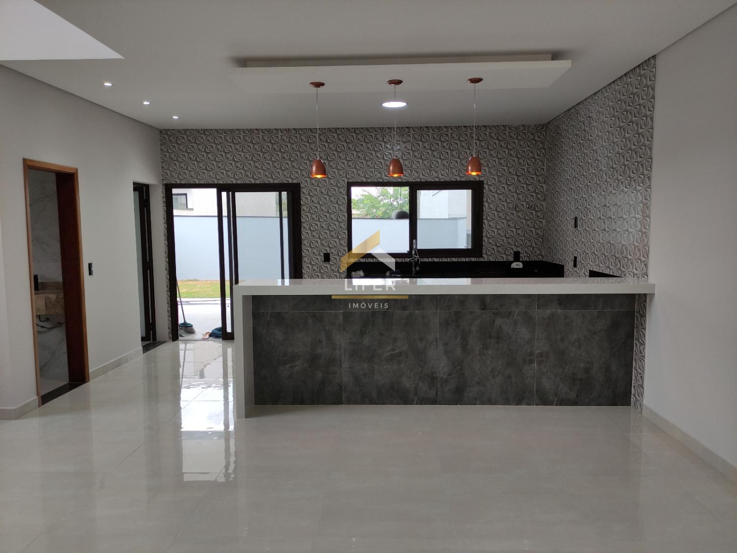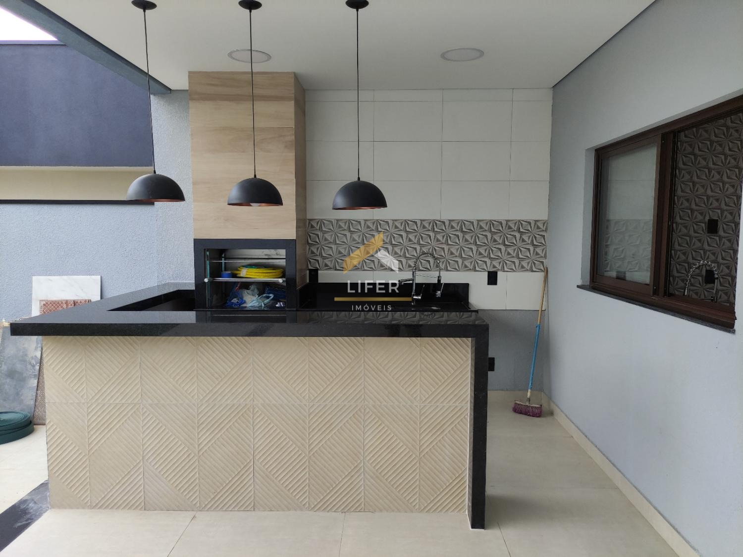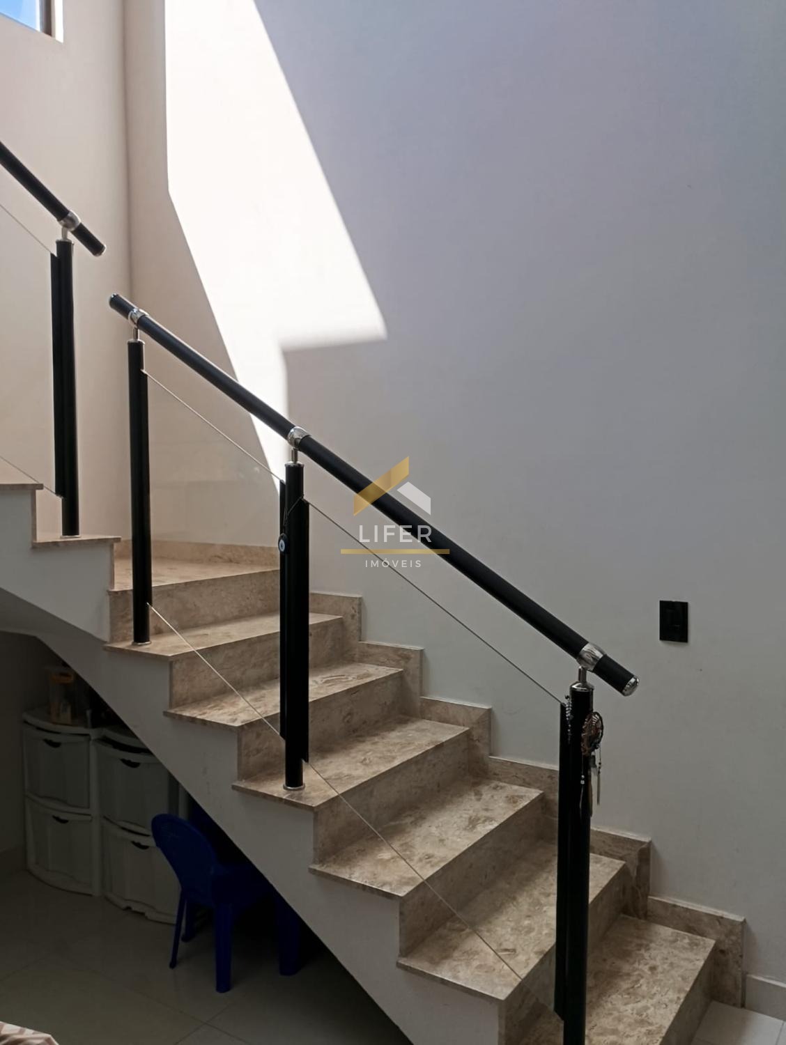A residência conta com sala de jantar integrada à cozinha americana, proporcionando um espaço amplo e agradável para o convívio diário. Dispõe ainda de área gourmet com churrasqueira, ideal para momentos de lazer, além de lavanderia independente. São três banheiros, todos com pias e nichos em mármore travertino, revestidos até o teto, evidenciando o cuidado com os detalhes.