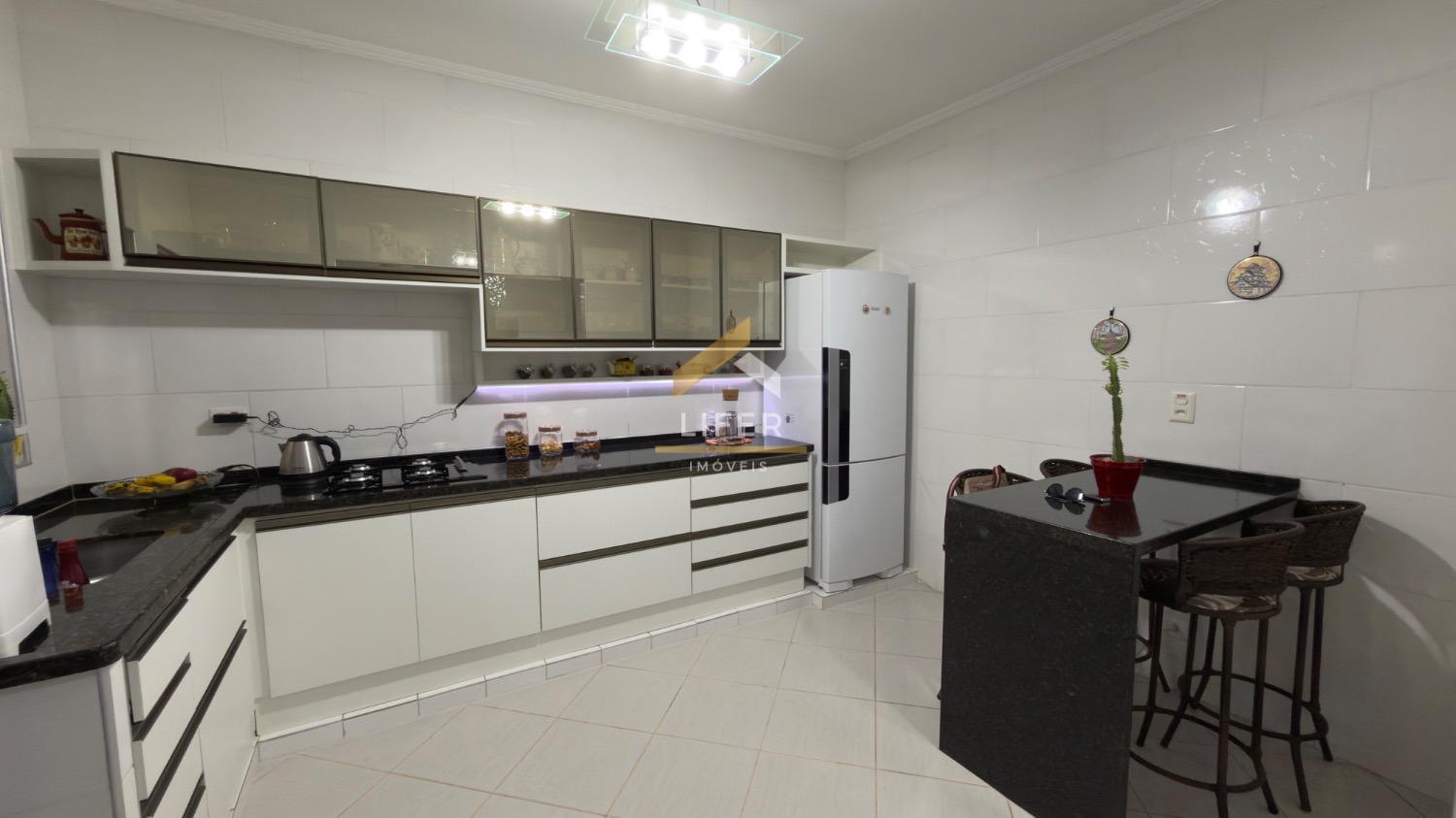 No piso inferior, dispõe de três salas amplas, proporcionando ambientes distintos de estar, jantar e convivência. A cozinha é integrada, planejada e equipada com cooktop, garantindo praticidade e modernidade ao espaço.