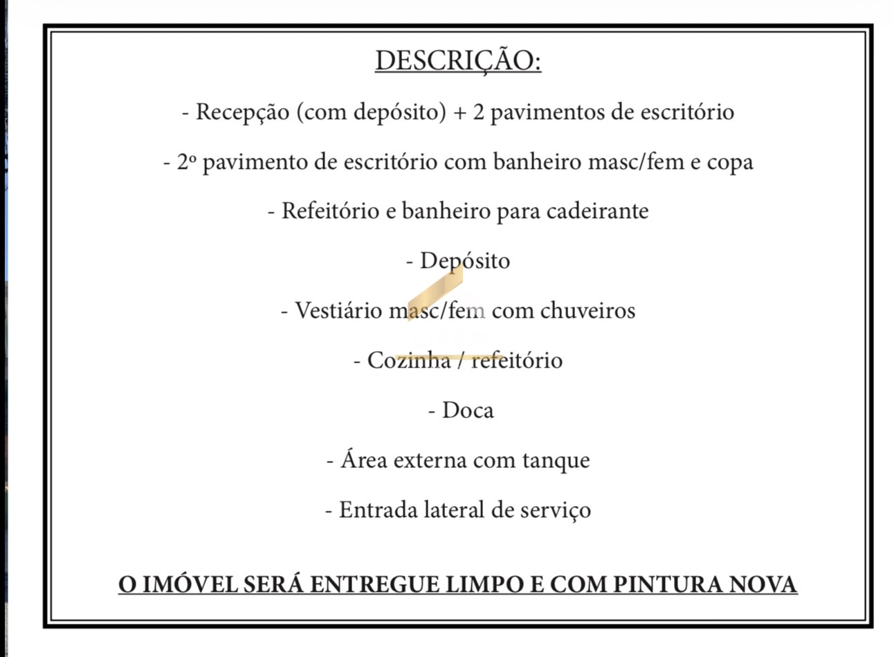 O imóvel possui 1.000 m² de área de terreno e 791,15 m² de área construída, oferecendo um espaço amplo e bem distribuído. Conta com recepção com depósito e pavimentos destinados a escritórios, incluindo um segundo andar com copa e banheiros feminino e masculino.